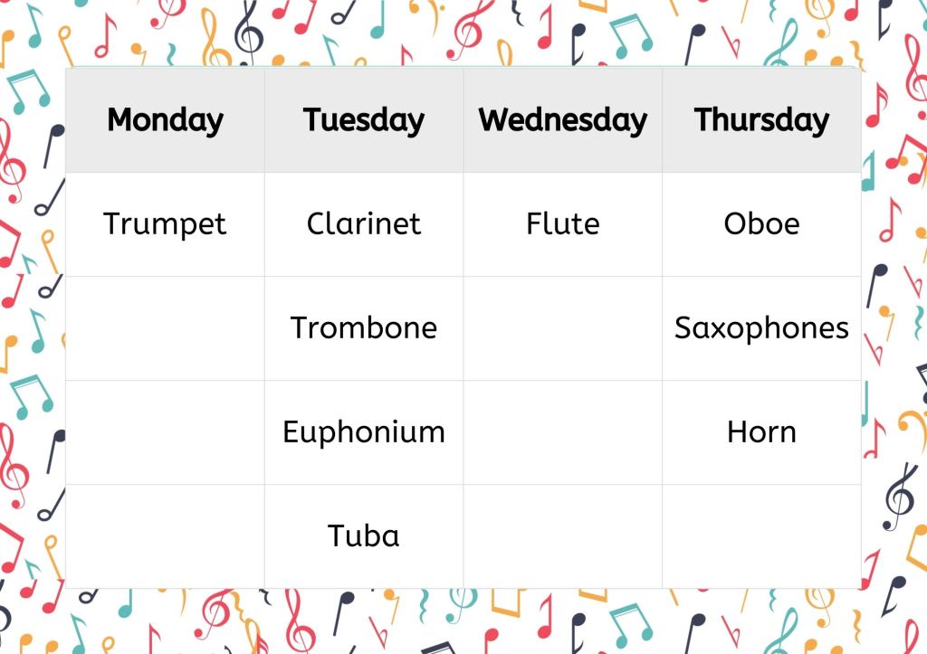 Sectionals will run from 4:00 PM – 5:00 PM, one day per week depending on their instrument. Activity Bus is available at 5:00 PM if you need a ride home. Please refer to the schedule below for your student’s assigned day.